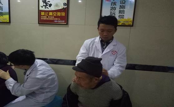 志愿者到达碧水蓝天之后,组长开始为志愿者讲解注意事项,然后志愿者们分为两队人,一队人去借服务时所需的桌椅板凳并进行布置,另一组便去邀请居民参加义诊。志愿者将被服务者带领到场地,为他们做按摩,与他们聊家常,让老人在义诊的时候感到有趣。志愿者们还会适时的询问老人们对按摩手法是否满意,如果老人感到有不舒适的地方志愿者就立即的改正,让老人们获得更加满意的体验。当为老人按摩完后,志愿者把老人扶到量血压处,为老人解开衣服,当老人量完血压后,志愿者为老人把衣服口子扣好,并且把老人小心扶起。老人也会问志愿者一些关于疼痛病症的问题,志愿者们都尽自己所能的为老人们解惑。时时刻刻把尊敬老人,爱护老人的思想贯彻在此次的活动中。