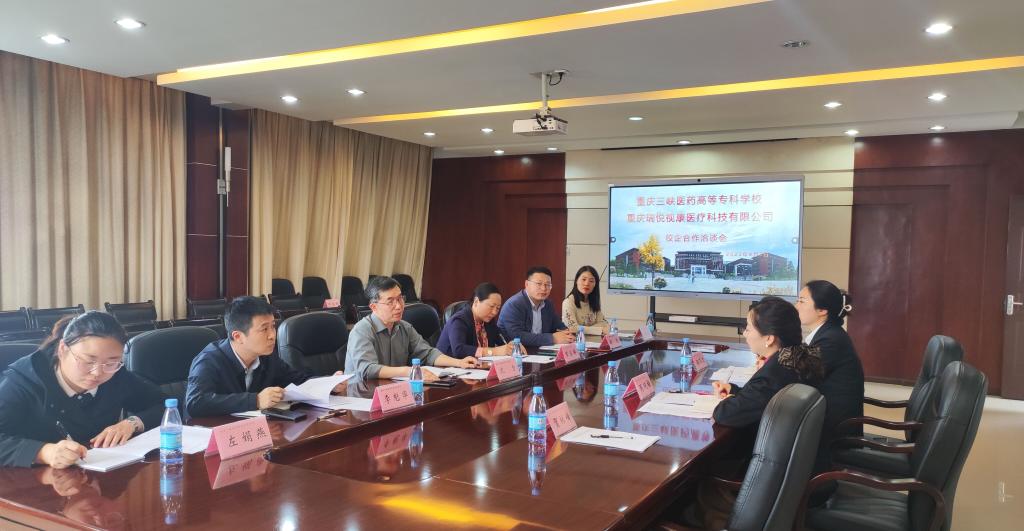 4月3日,重庆瑞悦视康医疗科技有限公司总经理周艳梅一行到校商讨合作事宜,学校在行政楼410会议室开展校企合作洽谈会。学校副校长沈力,合作交流中心、医学技术学院党政主要负责人及眼视光技术专业负责人参会。会议由医学技术学院郝坡院长主持。