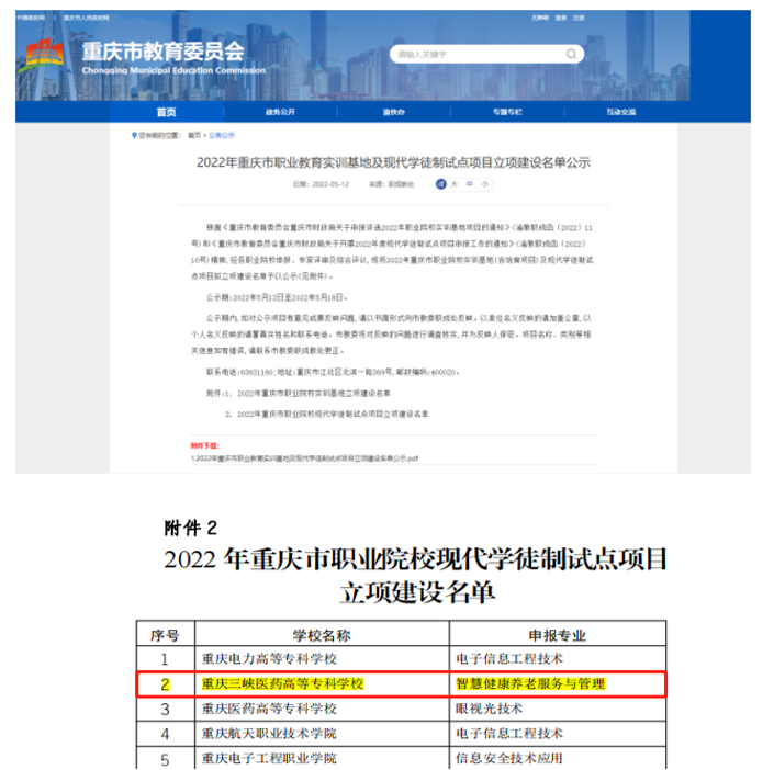 2022年5月,根据《重庆市教育委员会重庆市财政局关于开展2022年度现代学徒制试点项目申报工作的通知》(渝教职成函〔2022〕10 号),我校智慧健康养老服务与管理专业与重庆光大百龄帮康养产业集团有限公司合作的现代学徒制项目成功申报重庆市职业院校现代学徒制试点项目。
