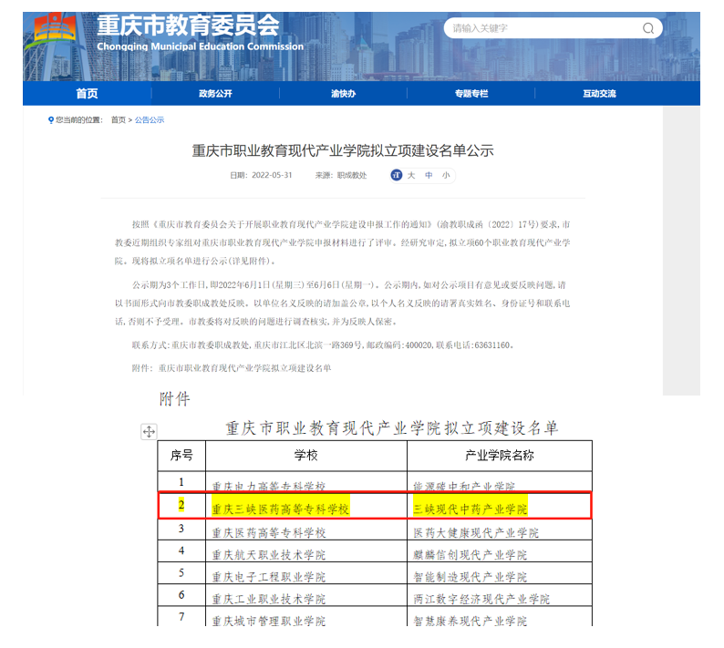 根据《重庆市教育委员会关于开展职业教育现代产业学院建设申报工作的通知》(渝教职成函〔2022〕17号),我校三峡现代中药产业学院成功申报重庆市职业教育现代产业学院。