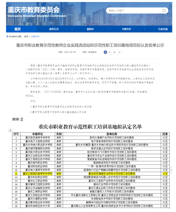 2023年8月,我校眼视光专业“重庆视觉健康防治示范性职工培训基地”成功认定重庆市职业教育示范性职工培训基地。