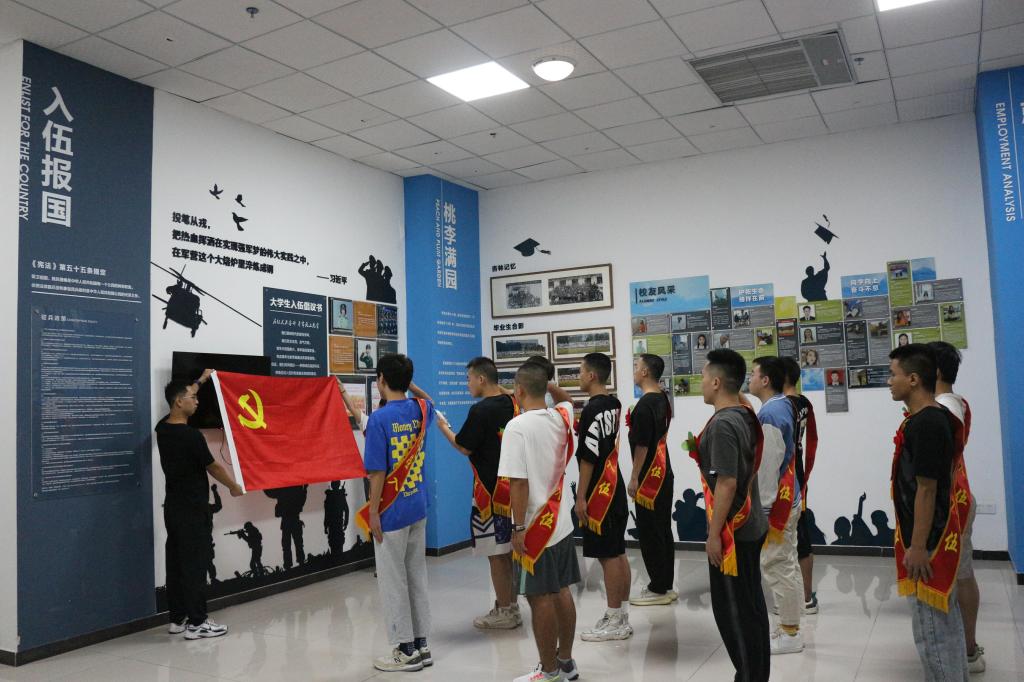最后冉隆平副书记,党委学生工作部、团委、各学院负责人及辅导员给大学生新兵佩戴了“光荣入伍”绶带和大红花。同学们整齐列队,对着党旗,宣誓“忠于祖国,忠于人民,保卫祖国领土与国家安全,保障人民生命。”