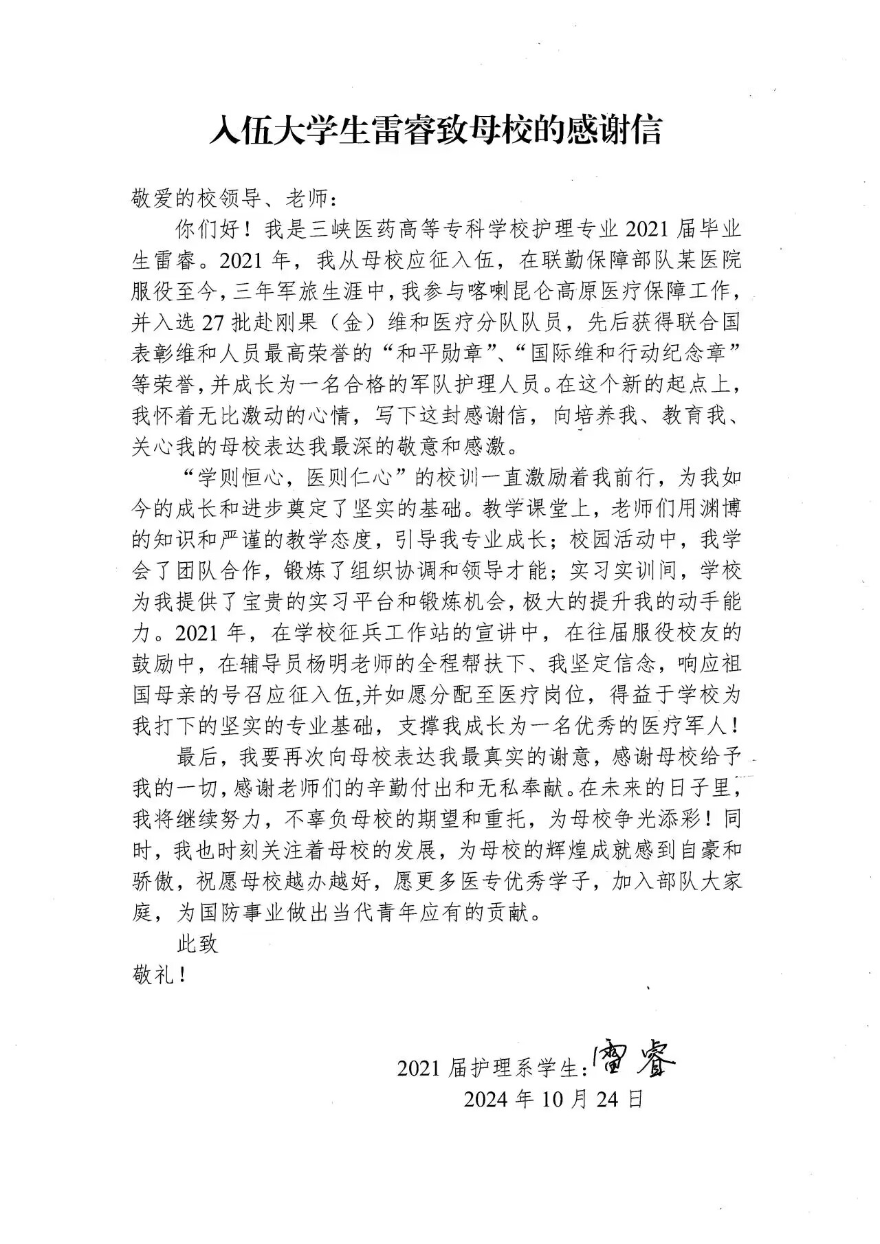 学校征兵工作站日前收到一封来自2021届护理毕业生雷睿的感谢信,彼时他正在刚果金维和部队执行海外驻扎任务,他信中汇报了参军入伍成长成才之路,更对母校的培养表达深深的感激之情。