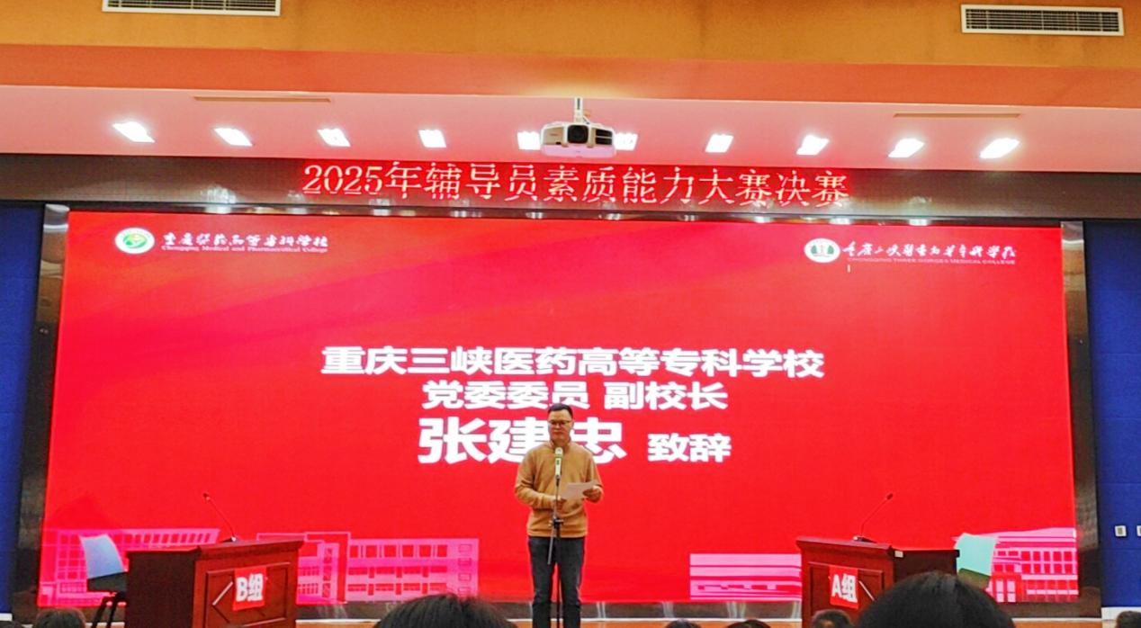 在现场师生的热烈掌声中,重庆医药高等专科学校副校长彭坤和重庆三峡医药高等专科学校副校长张建忠分别对本次大赛致辞。彭坤首先回顾了重庆医药高等专科学校的发展历程,以“知校情”达成“明学情”,引领学生知来处、明出处,并鼓励在场辅导员明确主责主业,培育时代新人。张建忠指出两校共同举办辅导员素质能力大赛,意义非凡,对本次大赛他提出三点希望:一是以饱满的热情、严谨的态度投入到比赛,展现扎实的育人能力和业务水平。二是珍惜机会,汲取经验,为今后的育人工作打下坚实的基础。三是聚焦主责主业,增强履职尽责能力,育好新时代新青年。