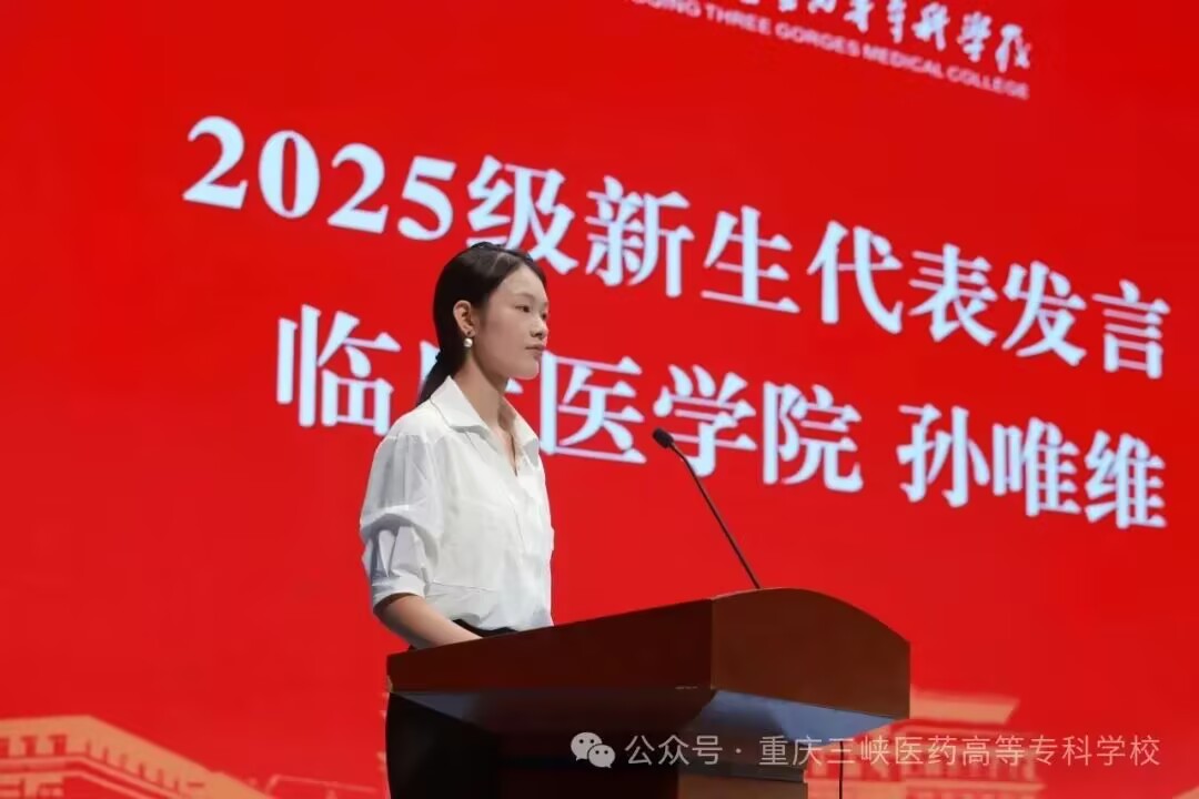 2025级临床医学院临床医学4班孙唯维作为新生代表发言。她满怀激动地分享了初入校园的感受,坦言面对未知的大学生活曾有忐忑,但更对探索医学知识、锤炼专业本领充满期待。她代表全体新生发出倡议:不做浮光掠影的“观光客”,要做深入专业腹地的“探险家”;不做单打独斗的“孤勇者”,要做汇聚伙伴力量的“连接者”;不做置身事外的“旁观者”,要做共建校园的“建设者”,并承诺将秉承“学则恒心,医则仁心”校训,践行新时代医疗卫生职业精神,为医药卫生事业发展不懈奋斗。
