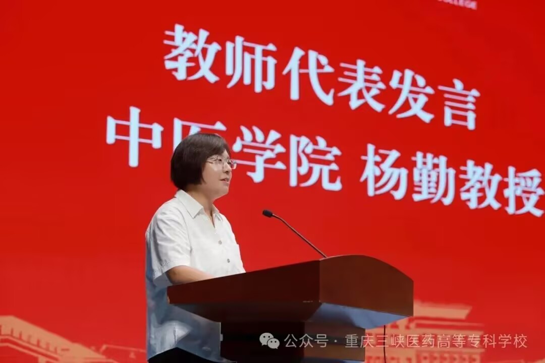 中医学院杨勤教授作为教师代表,勉励新生:要勇担使命,将个人理想融入“健康中国”建设,做有格局的医药人;要德业双修、仁心仁术,恪守医德、精进医术,做有温度的医药人;要全面发展、综合赋能,在学习之余提升综合素质,做有活力的医药人;要开拓创新、砥砺奋进,紧跟医学前沿,以锐气应对挑战,做有闯劲的医药人。她承诺全体教师将竭尽所能,为新生成长成才保驾护航。