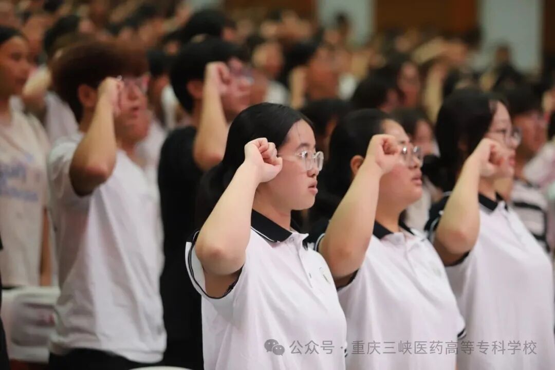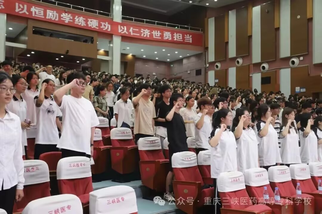 典礼尾声,全体新生高举右拳,庄严宣誓:“健康所系,性命相托……我决心竭尽全力除人类之病痛,助健康之完美,维护医术的圣洁和荣誉……”铿锵有力的医学生誓言回荡在演播大厅,也通过屏幕传递到每一位线上新生心中。至此,三峡医专2025级新生开学典礼圆满落幕,4025名新学子将带着学校的嘱托与期望,在医学道路上逐梦前行,书写属于自己的青春华章。