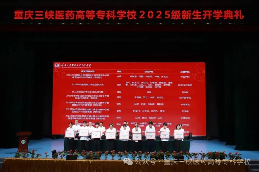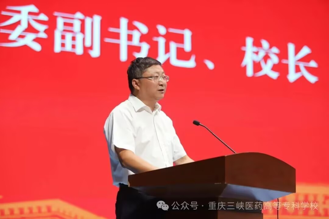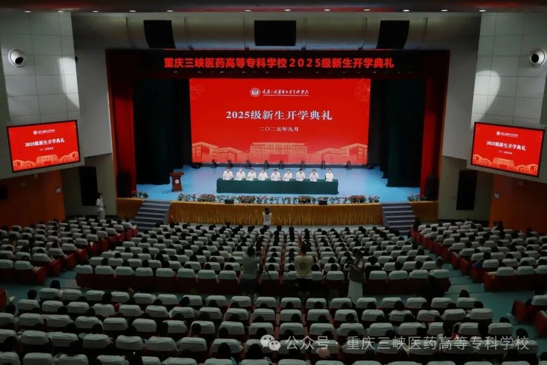 9月12日上午9时,重庆三峡医药高等专科学校2025级新生开学典礼在学术中心演播大厅盛大启幕。现场800名新生端坐礼堂,线上3200余名新生云端相聚,4025名“新医专人”跨越线上线下,携手开启医学求学新程。学校领导班子成员、各职能部门及学院负责人、学工系统全体人员、教师代表、校友代表出席典礼,开学典礼由党委委员、副校长邓雪松主持。