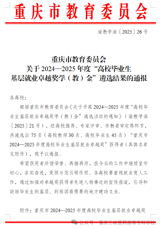 近日,重庆市教育委员会正式公布了2024-2025年度“高校毕业生基层就业卓越奖”获奖名单。我校临床医学院辅导员张海朝与2017届公共卫生管理专业毕业生余霞双双上榜。这一荣誉不仅是对获奖师生个人的高度认可,更是我校长期以来服务地方发展、引导毕业生扎根基层建功立业育人实效的集中体现。