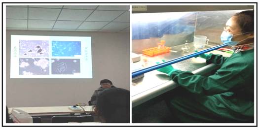 图-1刘丹老师和冯晓玲老师进行细胞培养理论和技能培训