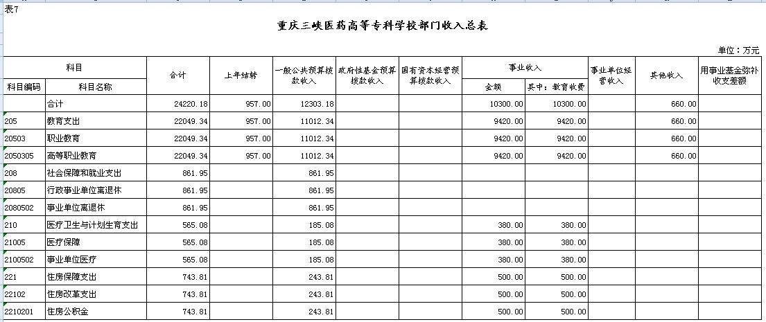 重庆三峡医药高等专科学校2016年部门收支总表