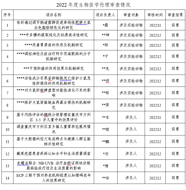根据《重庆三峡医药高等专科学校生物医学伦理委员会章程(试行)(三峡医专〔2022〕232号)文件规定,经本人申请、伦理委员会秘书格式审查、经伦理委员会委员评审,2022年共对“电针通过调节肠道菌群促进单纯性肥胖大鼠白色脂肪棕色化的研究”等14个项目开展伦理审查,其中涉及动物伦理审查8项,涉及人的伦理审查6项。现对审查情况公布如下表。