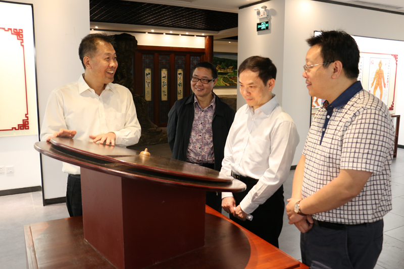 周建军书记(左一)、谭工副校长(左二)陪同任国胜院长(右二)、张先祥院长(右一)参观中医文化馆