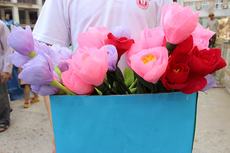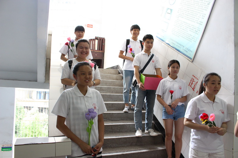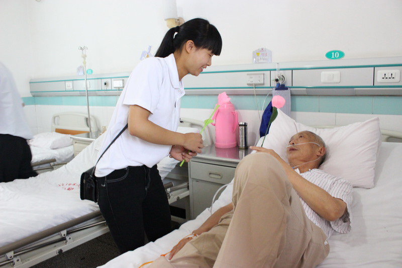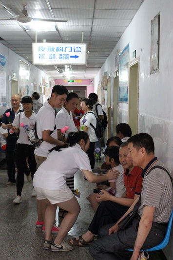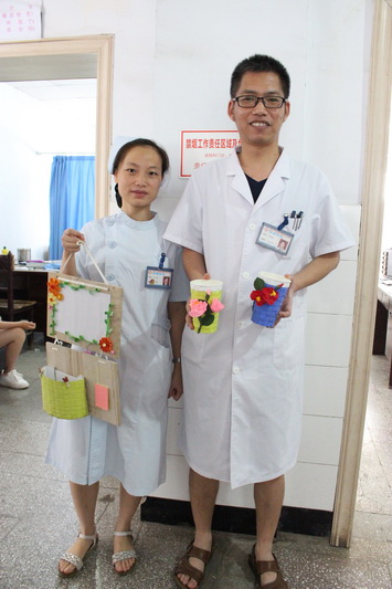 活动当日,社联同学们便早早起床做准备,他们顶着烈日,怀揣着热情,带上礼物,踏上了关怀之路,一到达附属医院,大家便分工行动起来。在皮肤科门诊和内六科住院部,就诊的病人排着较长的队伍,同学们纷纷送上用皱纹纸制作的康乃馨、玫瑰及郁金香,传递出期望患者“早日康复”的祝福,焦虑的患者顿时以笑容相迎,并纷纷点头以示谢意。之后,同学们又来到护士站和医生工作室,为医务人员送去漂亮的笔筒、置物盒、告示牌等物品,得到护士们和医生们的高度评价,医务人员还结合临床工作的需要,为这些工艺品提出了宝贵的修改意见,并表示希望此项活动能一直举办下去。同学们默默聆听并与服务对象交流着,看着自己的劳动成果能获得一直好评,心中满满的成就感。