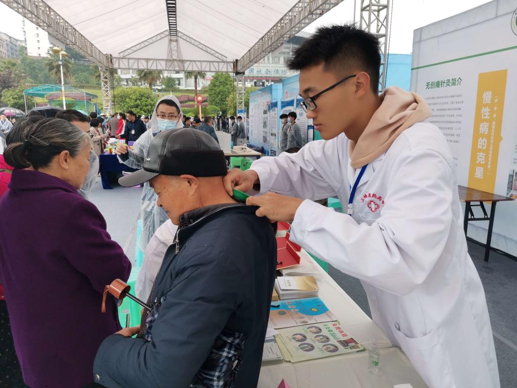 学校以“中医药文化传承与发展”为主题,开展了中医药文创产品展示活动及无痛针灸体验活动。同时向全区人民呈现了学校发展情况。开幕式结束后,刘小泉第一个来到我校展区进行视察。志愿者同学们现场为市民艾灸、展示中药香包制作,吸引了大量市民驻足参观、体验。在义诊现场学校重庆市名中医姜兴鹏主任医师为身体不适群众进行针灸治疗,充分展示了针灸的“神奇”,广大患者纷纷竖起了大拇指。