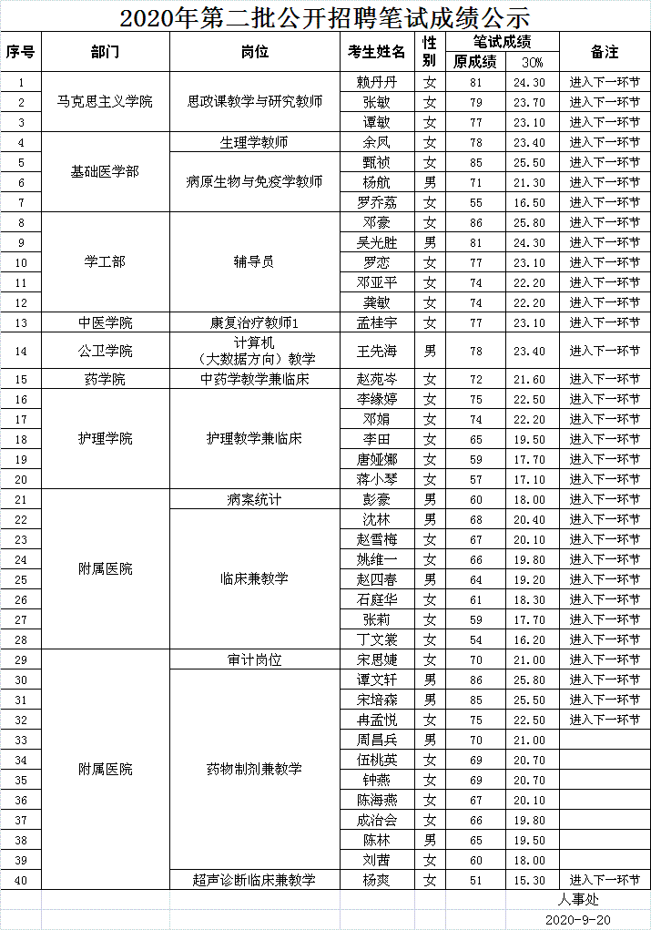 重庆三峡医药高等专科学校2020年第二批公开招聘笔试成绩公示