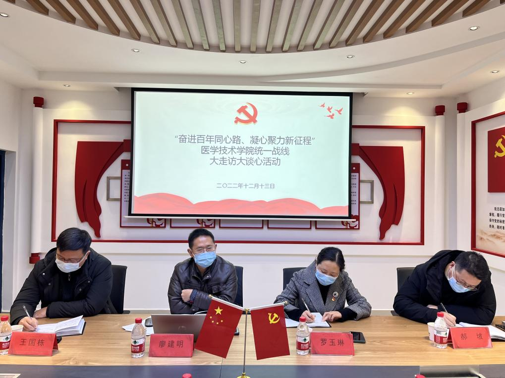 12月13日上午,根据学校党委的统一安排,学校党委委员、纪委书记廖建明一行来到医学技术学院,开展统一战线大走访大谈心座谈活动,党委宣传部部长王国栋、学院党总支书记罗玉琳、院长郝坡及学院农工民主党党员代表参加座谈,会议由学院党总支书记罗玉琳主持。