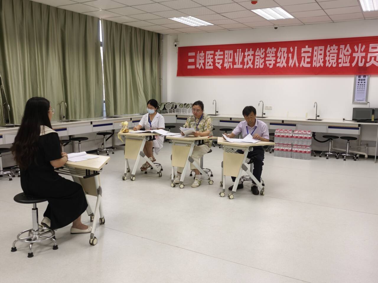 本次鉴定严格遵循国家职业技能标准,采取“理论+实操+答辩”三重考核模式。理论考试重点考察专业知识的掌握程度,如验光技术、眼镜定配技术、斜弱视处理技术等知识。实操考核则模拟真实工作场景,全面检验考生的实际操作能力和问题解决能力,如三级视功能检测、泪液破裂时间测量、半框眼镜的完整制作流程等。答辩环节重点考察学生对课题研究的理解深度、理论掌握程度及逻辑思维能力,包括研究方法的科学性、问题解决的可行性等,从而对其研究能力进行评估。考评员依据评分细则,严格对操作流程规范度、熟练度、应对突发状况处理能力进行评估。