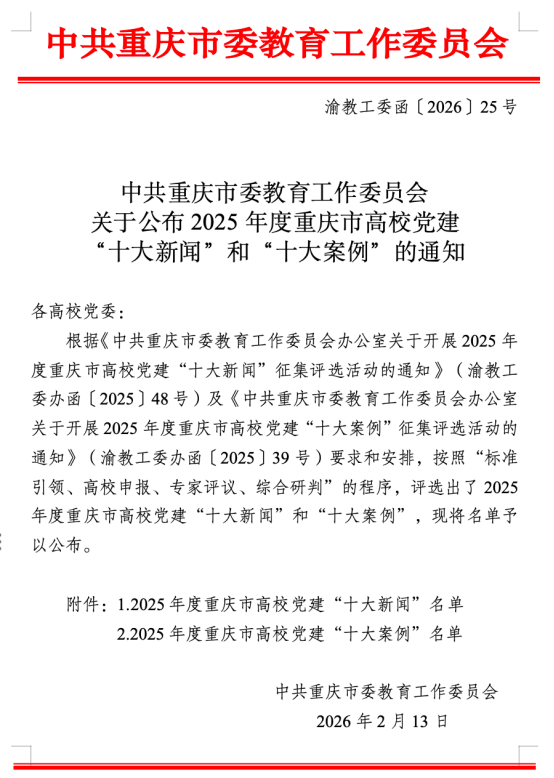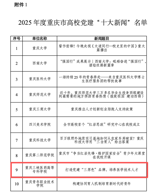 近日,重庆市委教育工作委员会公布2025年度重庆市高校党建“十大新闻”评选结果,我校医学技术学院《打造党建“三原色”品牌,培养医学技术人才》的典型经验与显著成效荣耀上榜。此次入选,既是对我校基层党建工作创新实践的高度认可,也是我校坚持以高质量党建引领高质量办学治校的又一标志性成果。