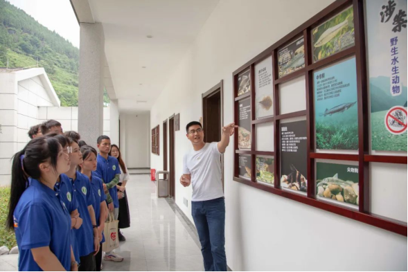 接着步入滨江生态法庭中庭,左右两侧墙上分别为水域环境司法教育、生态法治措施展板。法庭干警首先为大家介绍在万州区法院审理破坏长江流域生态环境的典型案件,以及《中华人民共和国长江保护法》和长江重点水域“十年禁渔”政策实施情况。随后,带领同学们来到水域环境司法教育展板,为大家解释了“增殖放流”“补植增绿”两个概念,指的就是法院推行“生态恢复型司法”策略,在环境遭受非法破坏后,通过放归鱼苗、种植树木等措施恢复,保护环境。