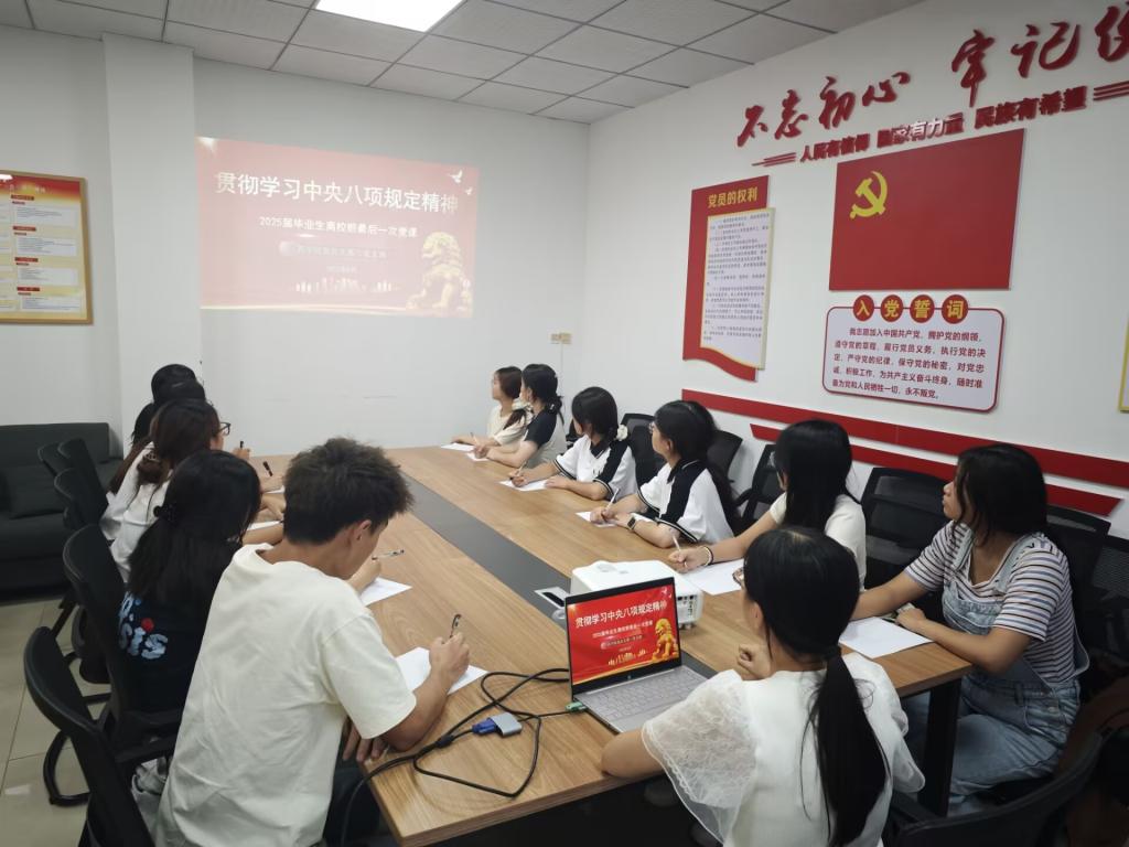 最后,支部书记对本次党课进行总结,并向全体毕业生学生党员提出三点明确要求。一是要将学习贯彻中央八项规定精神作为长期政治任务,做到常学常新、常抓不懈。二是要发挥党员“头雁效应”,未来在工作岗位上以身作则,以实际行动传递纪律意识与优良作风。三要推动八项规定精神“内化于心、外化于行”,将纪律规矩转化为日常行为习惯,真正实现知行合一,以过硬作风为职业生涯保驾护航。
