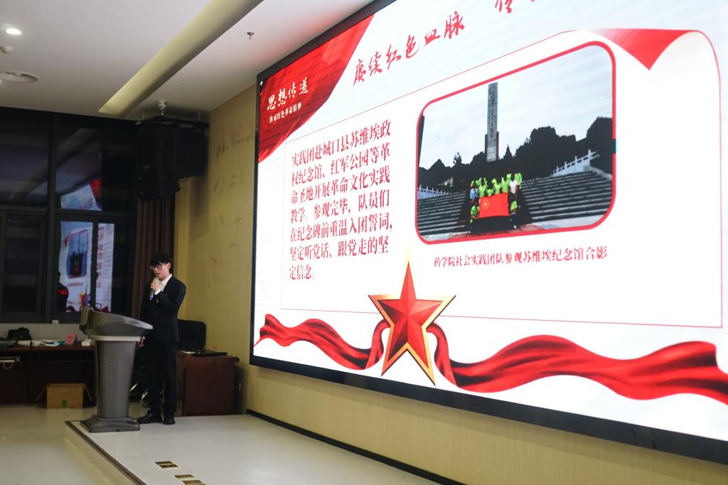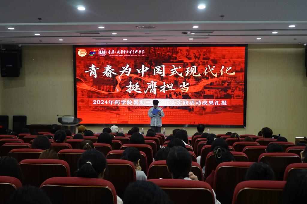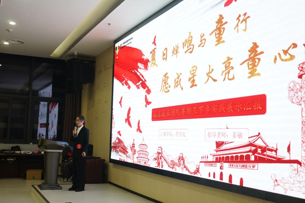 为全面总结“三下乡”社会实践活动成果。10月17日晚七点,2024年药学院暑期三下乡社会实践活动成果汇报会在图书馆B201拉开帷幕。本次汇报会邀请了药学院团总支负责人张洋老师、团总支老师何枚红和团学干部何梁、袁思杰、李雪花、童城铃担任汇报会评委,药学院100余名学生代表参加观看汇报会。