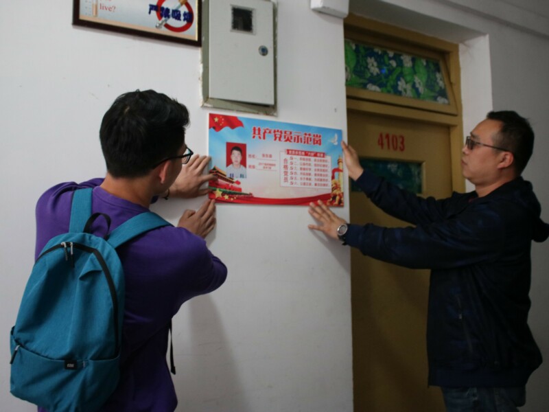 随后,全体党员重温党的誓词,宣誓了“亮明身份践宗旨,严格标准做表率”的决心。最后,教师党员和学生党员一起领取了“党员示范岗”公示牌,来到学生公寓现场挂牌。支部教师党员还采取“一对多”的形式与学生党员结对,将在思想、学习、生活和工作等方面对学生党员进行指导,并共同完成党员示范岗的各项任务。