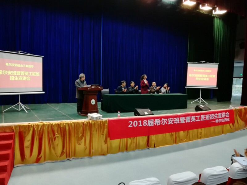 2018年11月15日,学校与重庆希尔安药业有限公司在学术中心205会议厅隆重举行中药专业现代学徒制试点项目2018级“希尔安班暨菁英工匠班”招生宣讲会。重庆希尔安药业有限公司副总经理吕姗姗、人力资源中心总监何兴平等一行4人,以及我校张建忠副校长等领导和药学系师生代表500余人出席大会。
