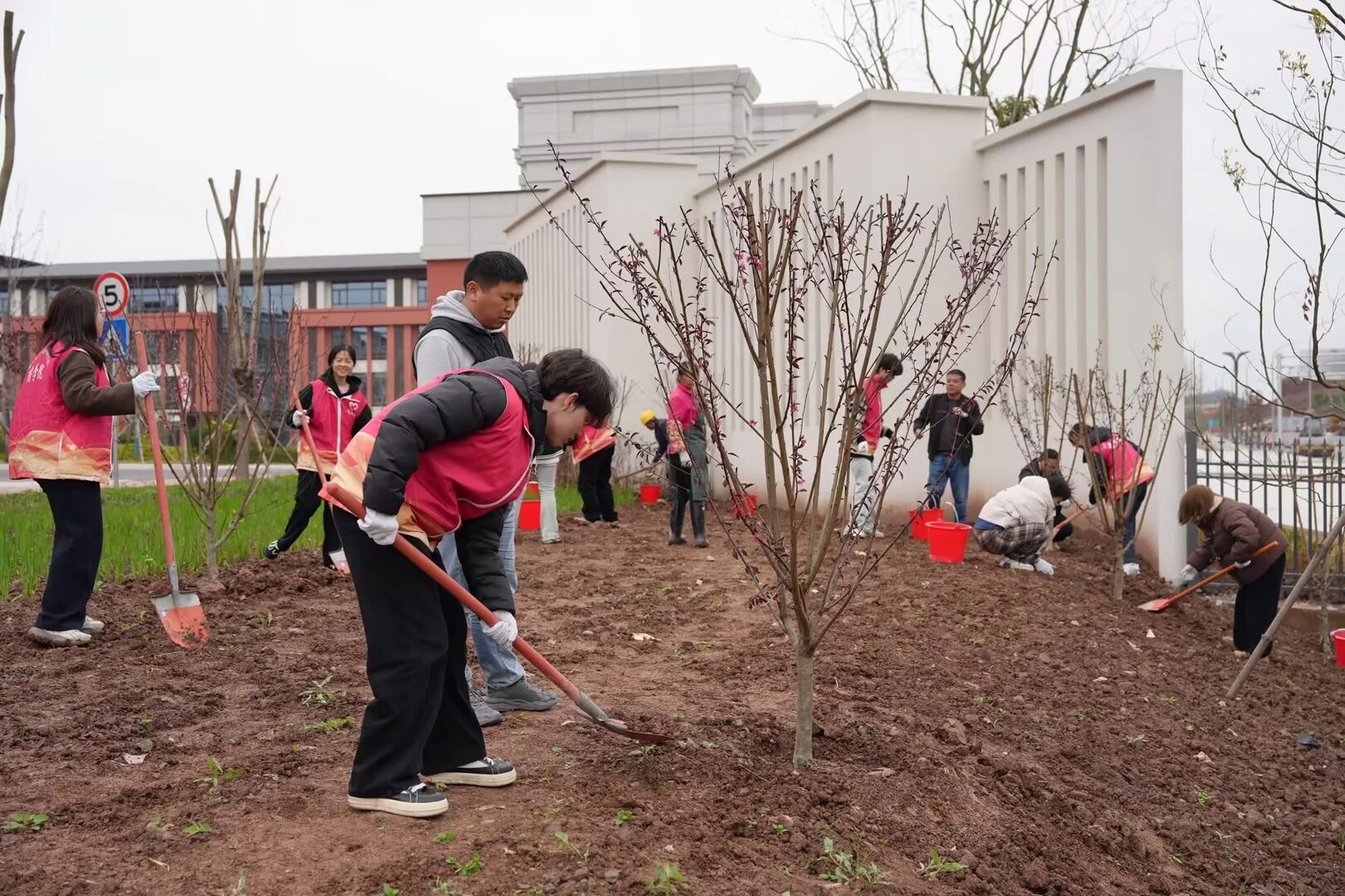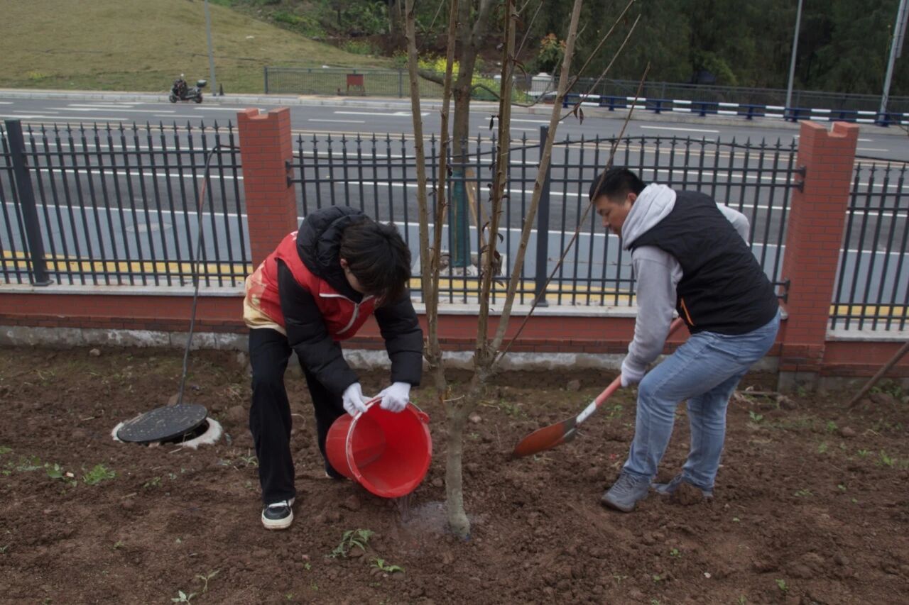 党课结束后,全体师生来到植树区域,分工协作、挥锹铲土、扶苗固根、浇水养护,以实际行动为新校区添绿。