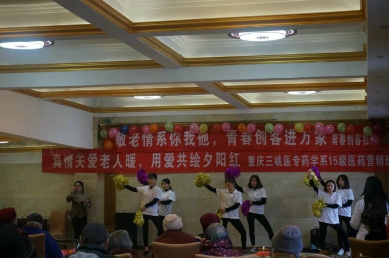 2015级医药营销班的同学向老人们献上精心准备的文艺汇演,大家载歌载舞,欢声笑语,欢聚一堂。敬老院的老人也高兴地献上精彩的节目,其中一位90高龄的抗美援朝老人演唱了中国人民志愿军战歌,“雄赳赳、气昂昂……”,91岁的老爷爷为我们三峡医专学子自编自创一首欢迎歌“欢迎,欢迎,欢迎医专的学子……”,是那样感人肺腑和充满喜气。我们在老人们的身上学到了积极乐观生活态度和爱党爱国激情,以及艰苦朴素的生活方式。