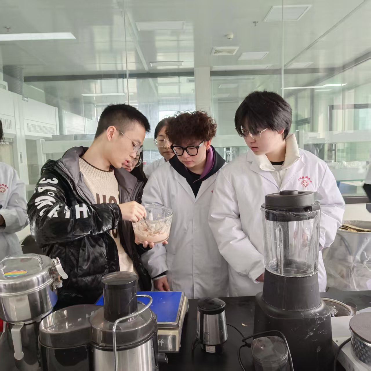 见习分阶段有序推进,重点突出“研发+检测” 双核心能力培养。第一周,21名学生分为3个研发小组,以 “低脂鸡胸肉丸” 为实践载体,系统钻研山药、葛根等药食同源食材的科学添加工艺,攻克配方优化、关键工艺参数控制、产品感官与理化品质评价等核心环节,沉浸式体验功能性食品从概念设计到产品雏形的转化过程。第二周,实训重心转向品质检测模块,学生重组为2个检测专项小组,借助高效液相色谱仪、微生物培养箱等专业仪器,采用国家标准方法对自制肉丸的钠含量、脂肪含量及微生物指标开展精准测定,熟练掌握数据处理、结果分析及规范检测报告撰写等实操技能,实现 “研发成果+检测验证” 的闭环实践。