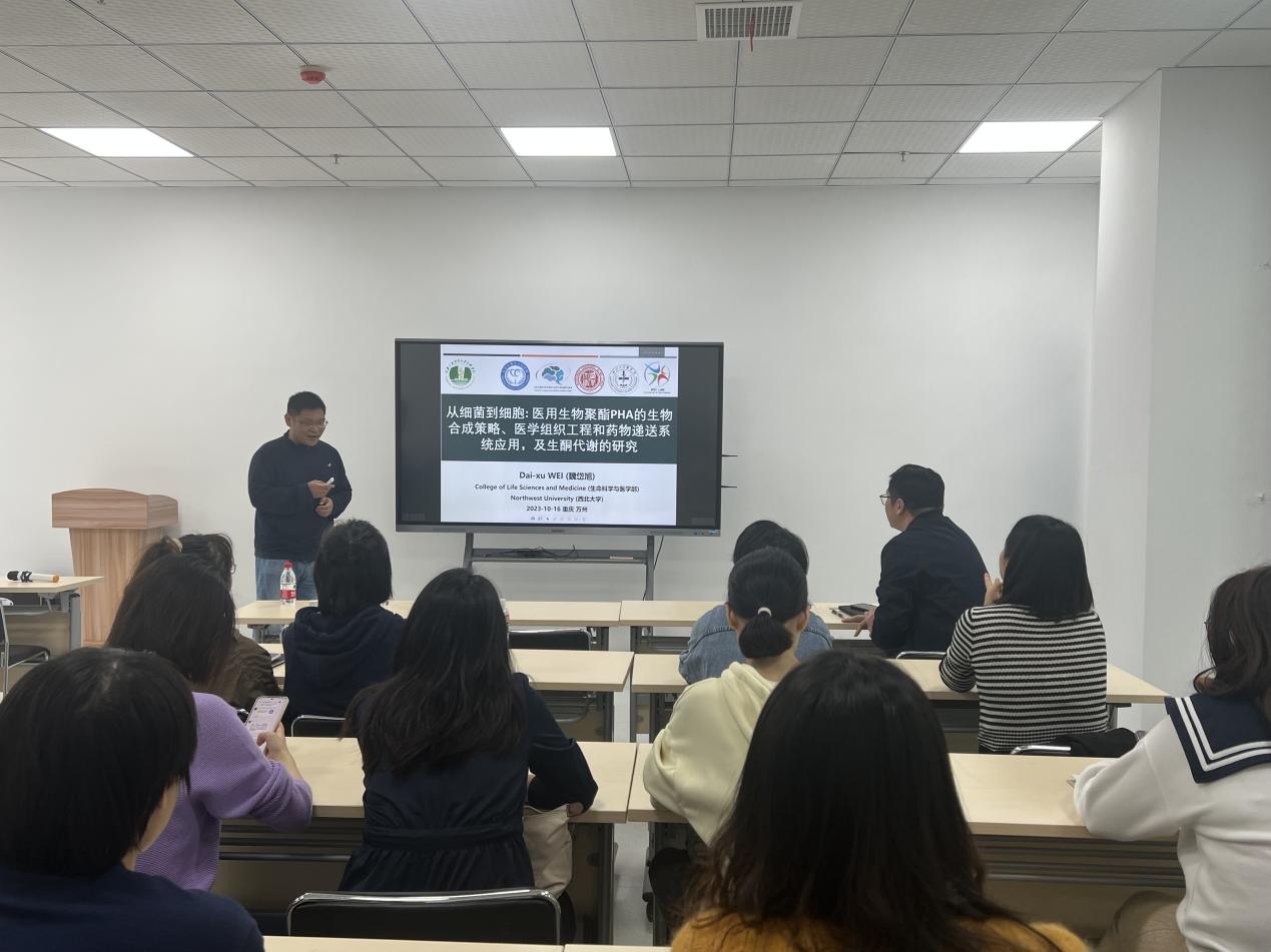 10月16日上午,西北大学生命科学与医学部医学院博士生导师魏岱旭教授应邀在学校三峡库区道地药材开发与利用重庆市重点实验室做了题为“从细菌到细胞:医用生物聚酯PHA的生物合成策略、医学组织工程和药物递送系统应用,及生酮代谢的研究”的学术报告。报告内容丰富,观点独到,对PHA在医学领域的应用进行了系统阐述,获得了在场师生的积极反响,预示着两校在合成生物学和PHA的深入研究与应用方面可能进行卓有成效的合作。