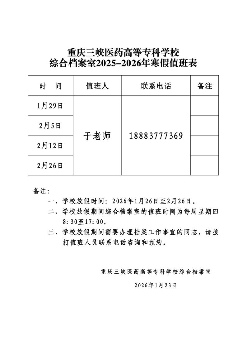 综合档案室2025-2026年寒假值班表