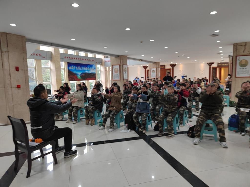 在基地大厅。同学们初步学习了养生功法,尝试了八段锦健身操,学习了护眼小知识。