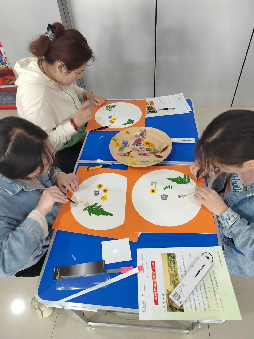 在中药科技馆,学生们学习到各种中药材的知识。在老师的指导下,学生们聚精会神地用植物标本组装图案,自由创作出不同风格的作品。