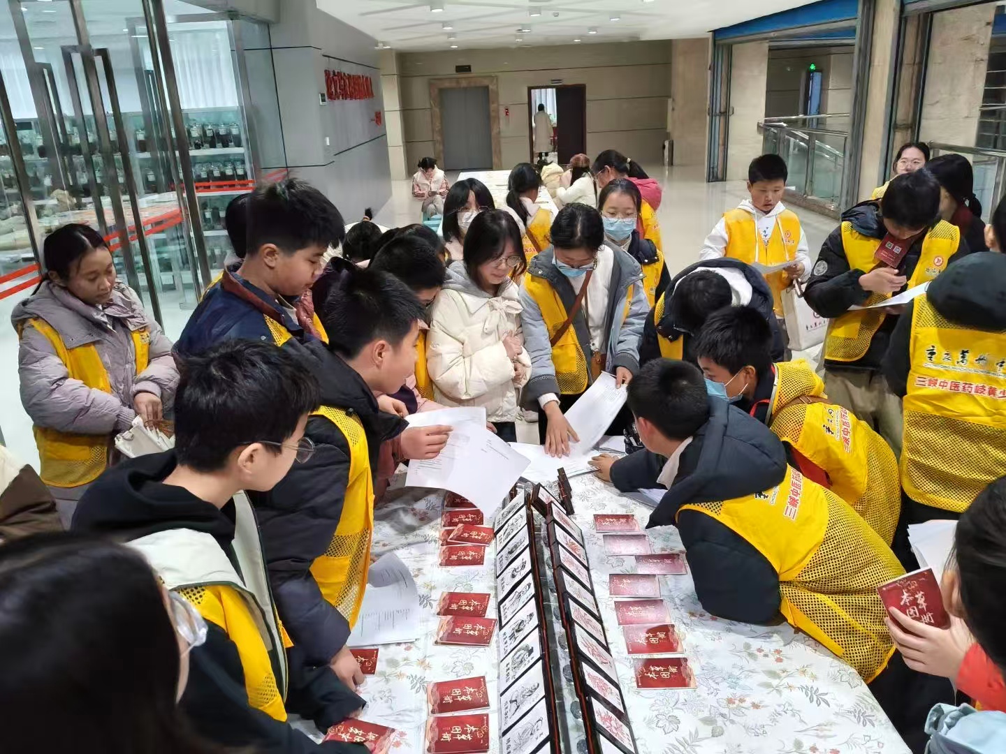2025年12月11日,万州中学岐黄少年班秋季学期的30余名同学来到中药科技馆参观研学。短短一个小时的时间里,中药科技馆的贾晗老师为同学们悉心讲解三峡库区中药材的资源分布与产业情况,介绍大型标本如玳瑁、灵芝、鹿茸等的药用价值,还邀请药学院的赵苑岑老师为同学们讲解药食同源相关的知识。参观结束后,同学们在中药科技馆原创设计的本草图册上盖上自己喜欢的中草药和历代名医印章,收获满满地结束了本次活动。