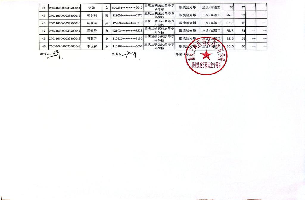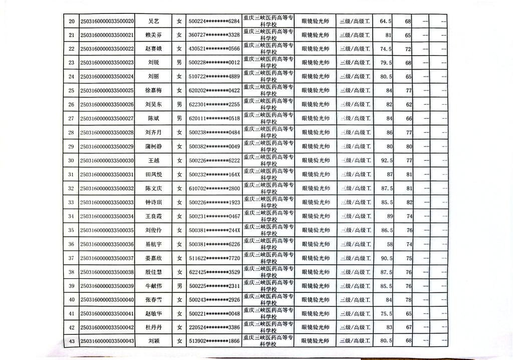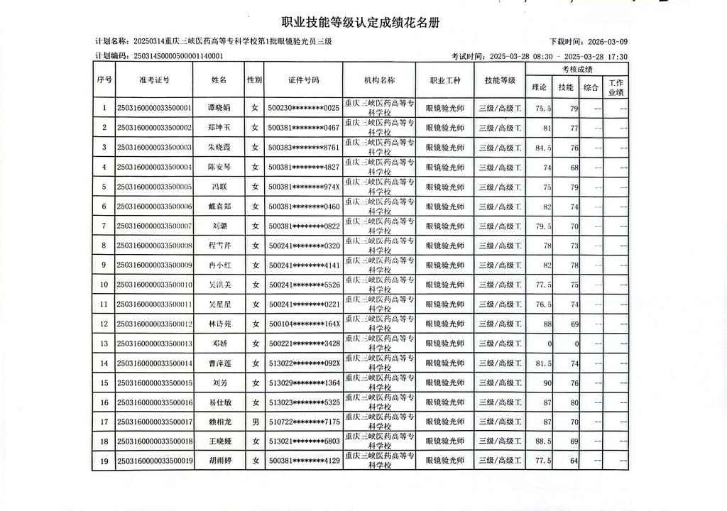 2025(0314)重庆三峡医药高等专科学校第1批眼镜验光员三级于2025年3月28日考试结束,现将考试成绩予以公示(详见附件)。