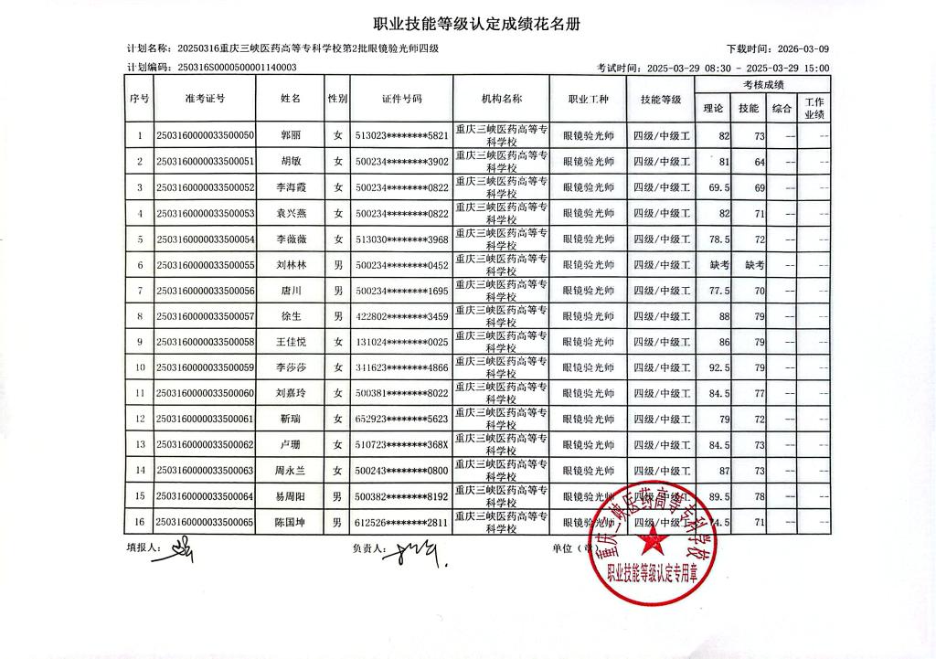 2025(0316)重庆三峡医药高等专科学校第2批眼镜验光师四级于2025年3月29日考试结束,现将考试成绩予以公示(详见附件)。