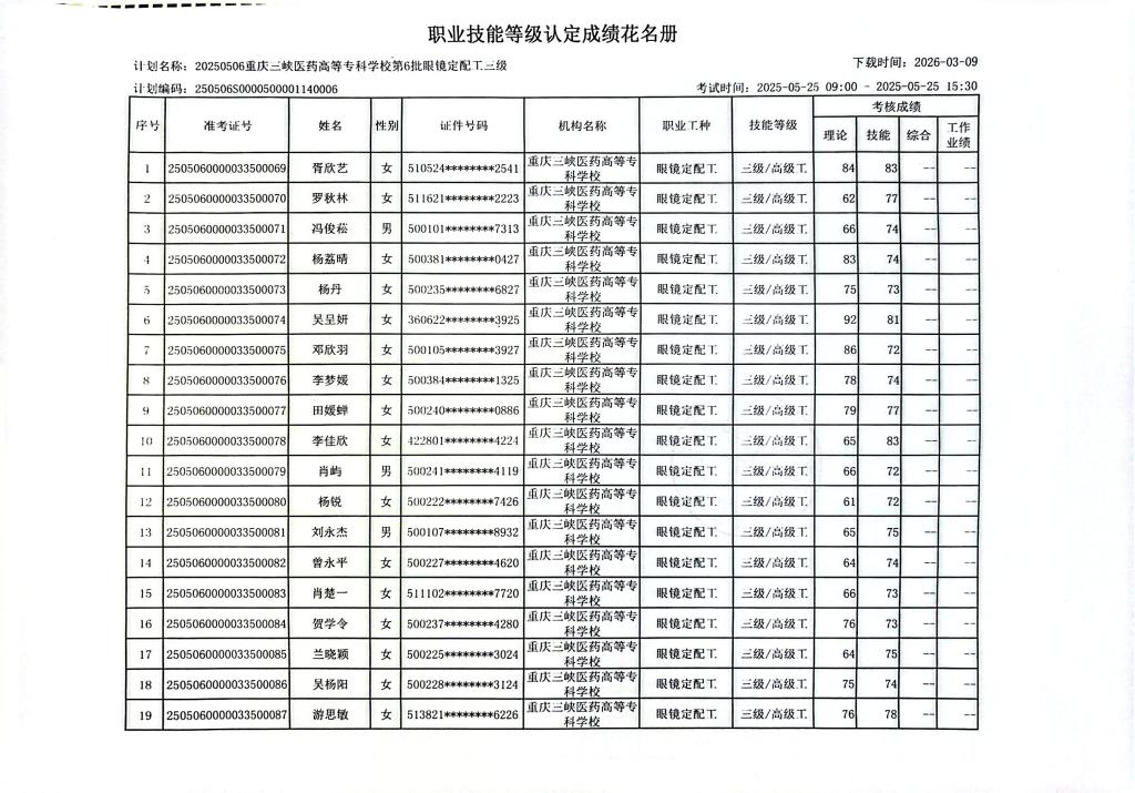 重庆三峡医药高等专科学校第6批眼镜定配工于2025年5月25日考试结束,现将考试成绩予以公示(详见附件)。
