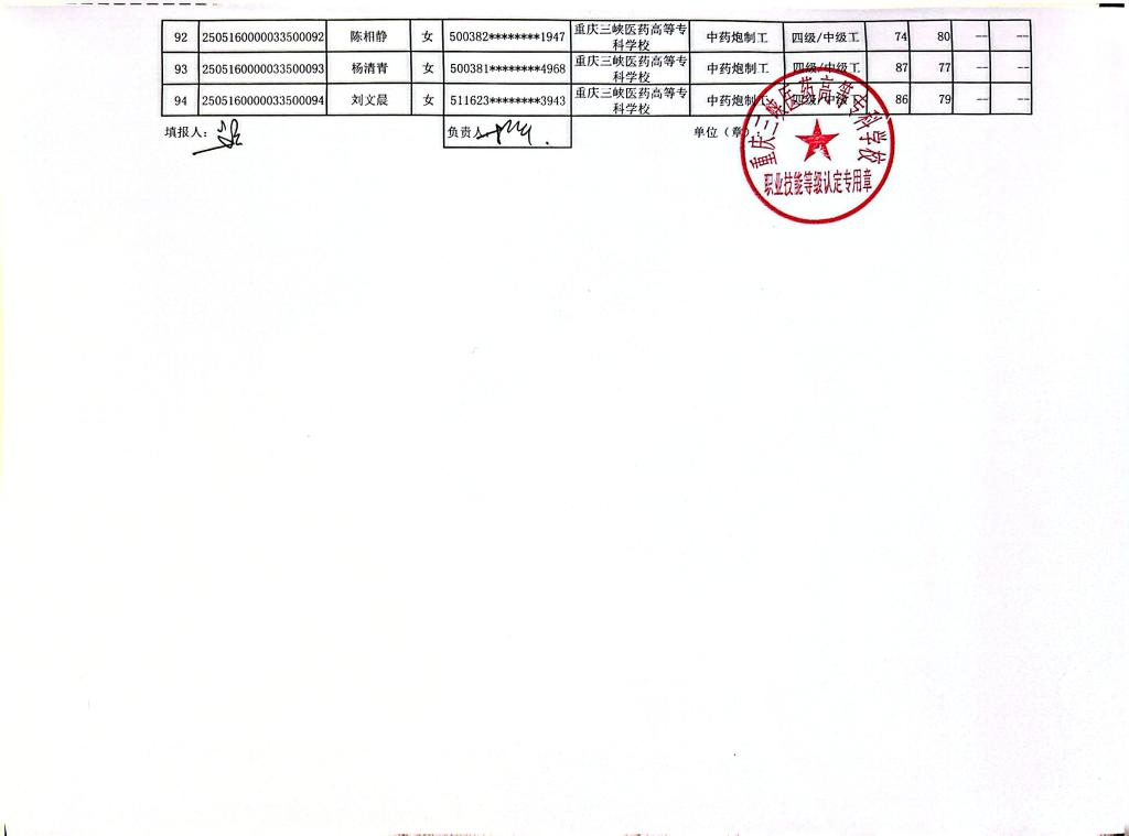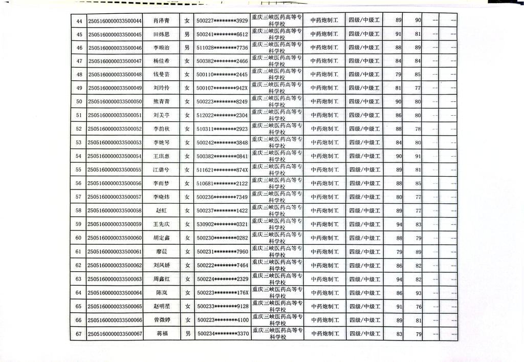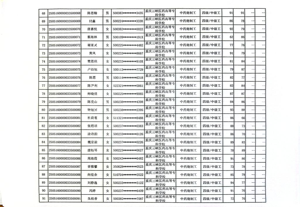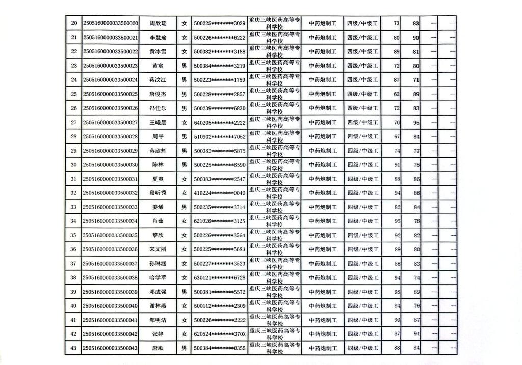 重庆三峡医药高等专科学校2025年第9批中药炮制工四级成绩公示