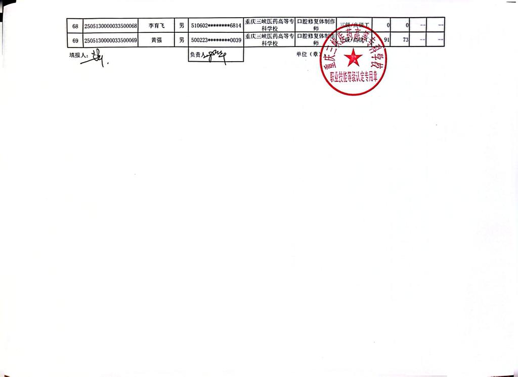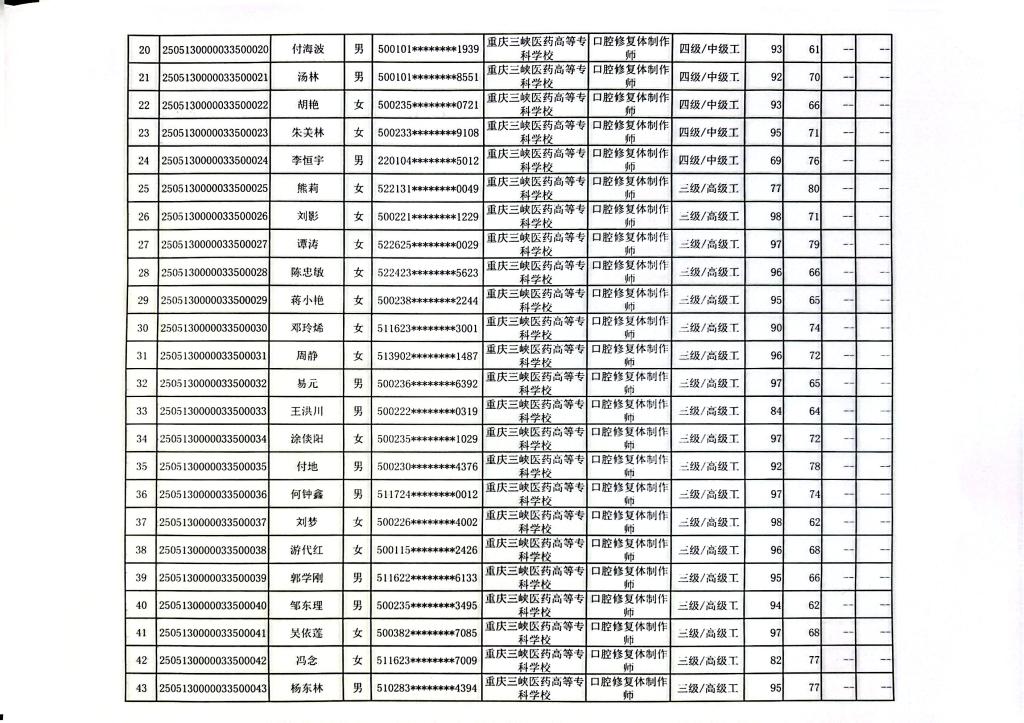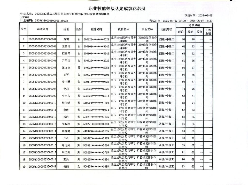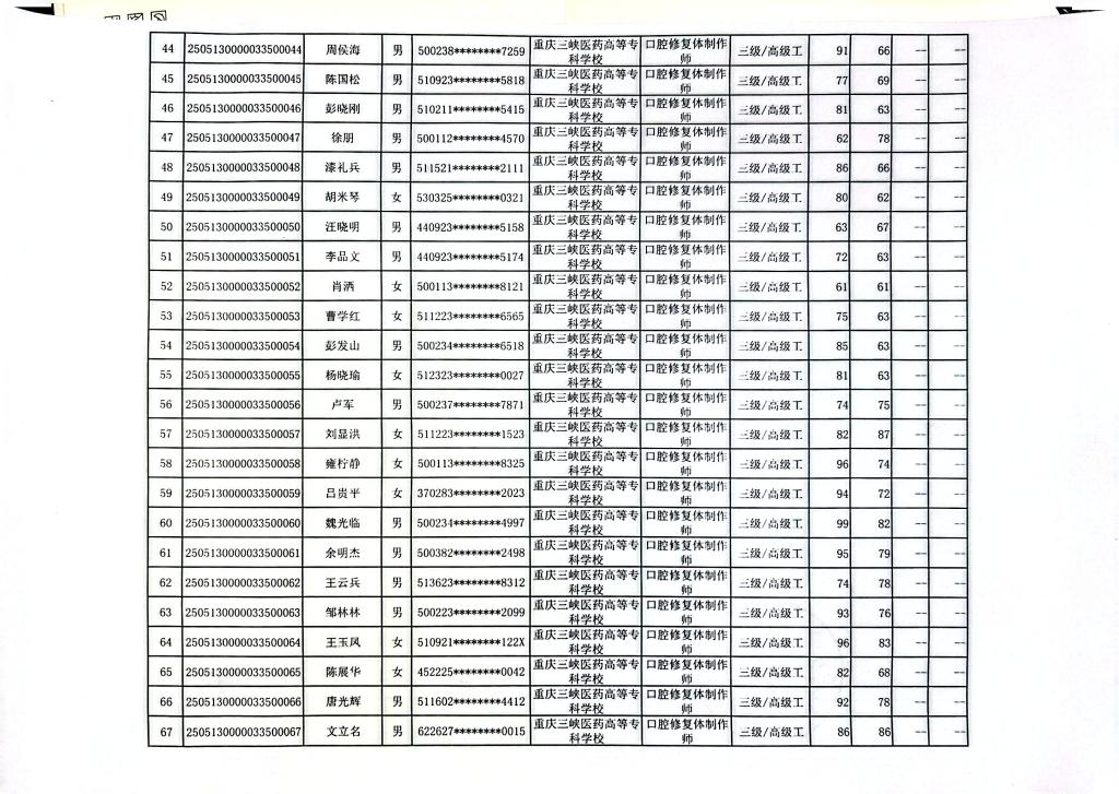 重庆三峡医药高等专科学校2025年第8批口腔修复体制作师三四级成绩公示