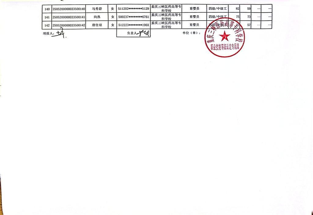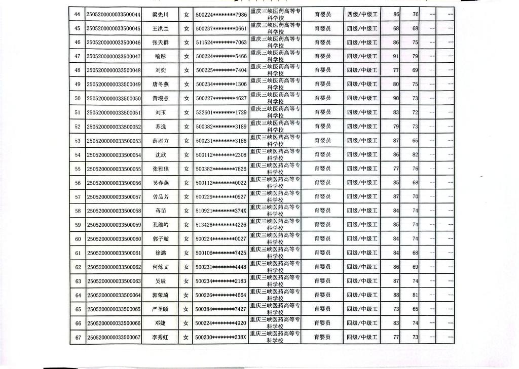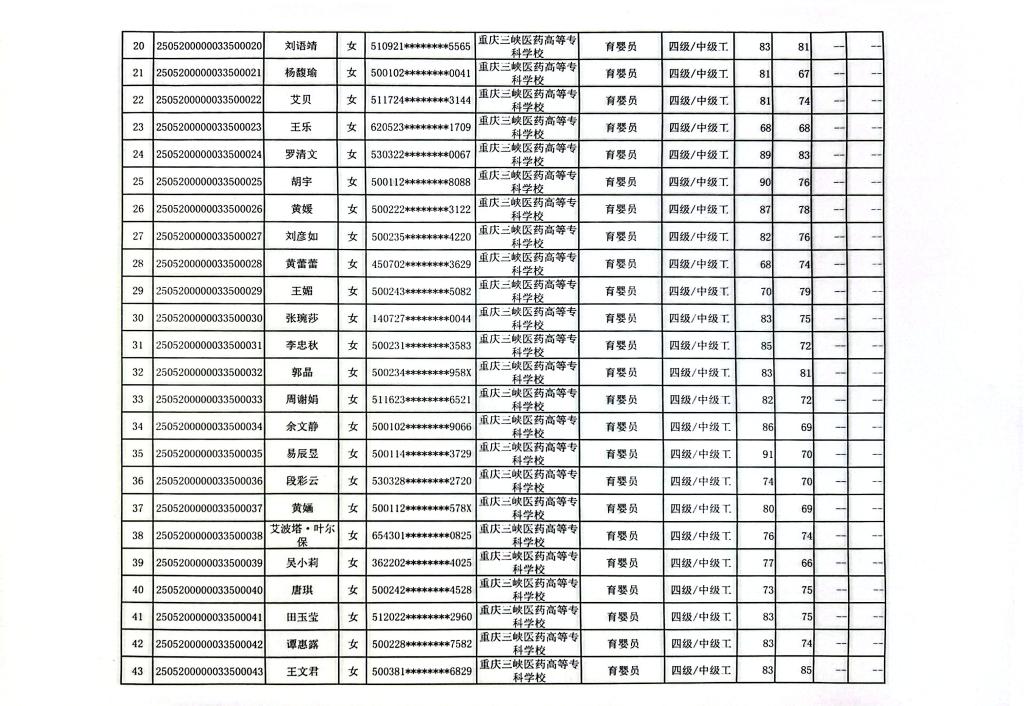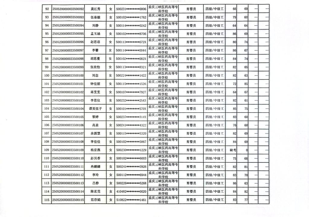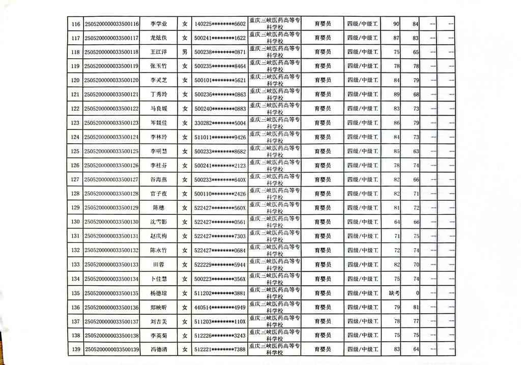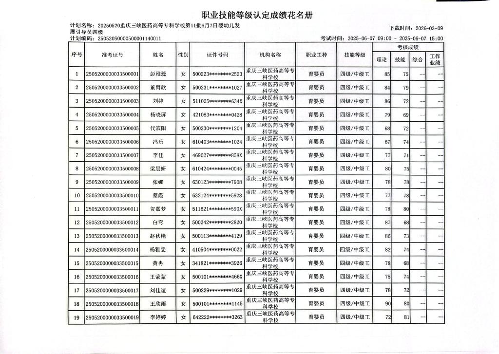 重庆三峡医药高等专科学校2025年第11批婴幼儿发展引导员四级成绩公示