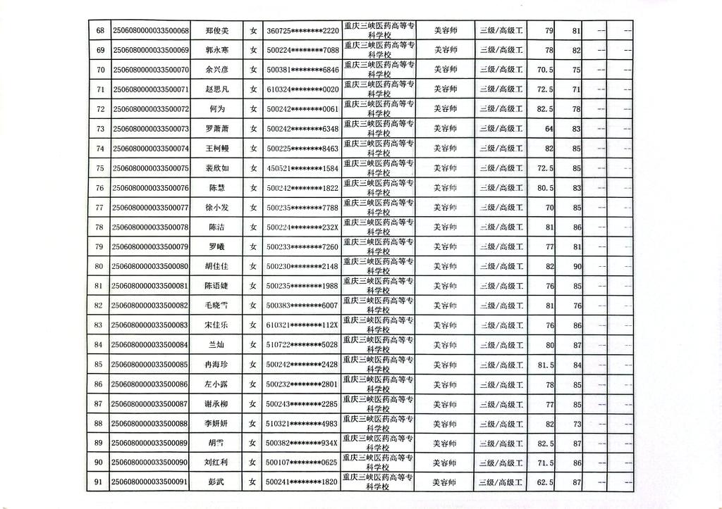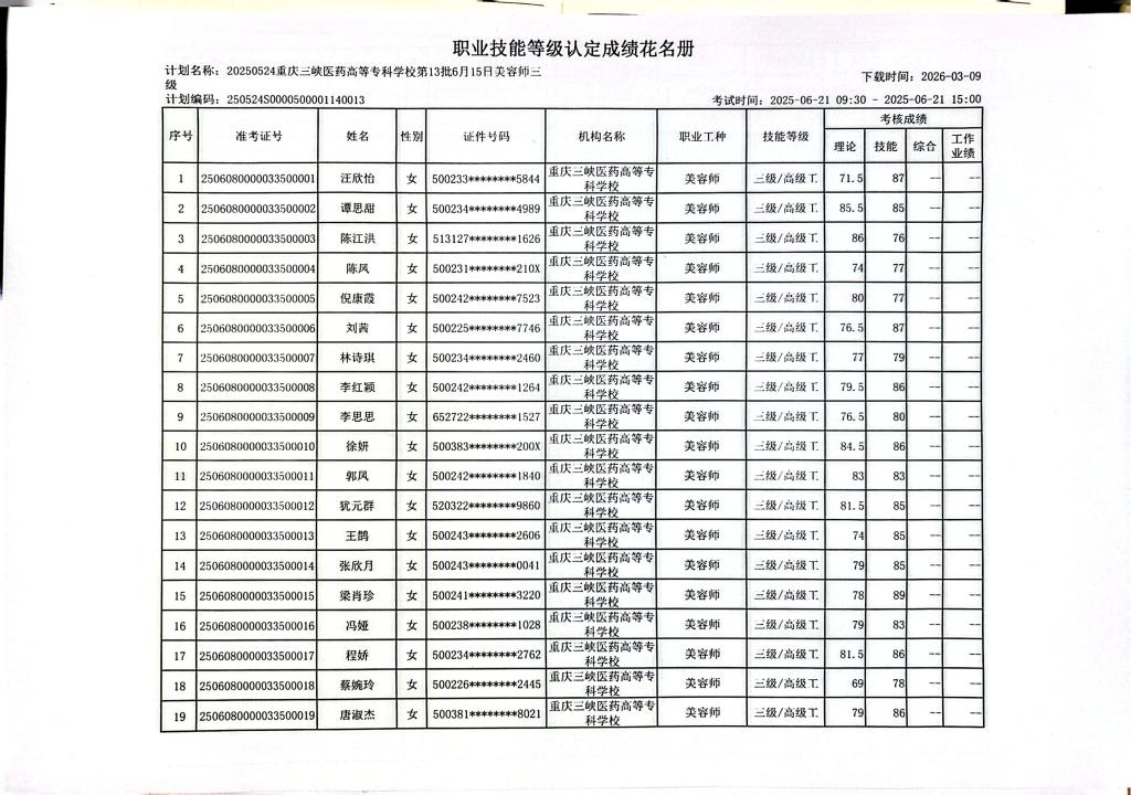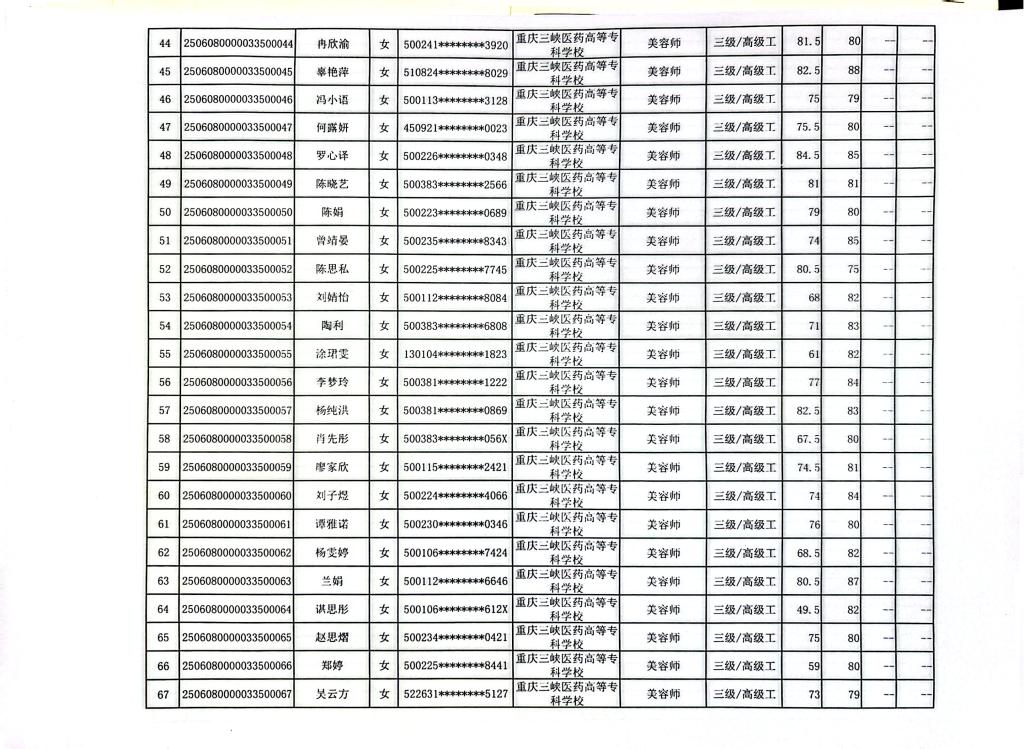 20250524重庆三峡医药高等专科学校第13批6月15日美容师三级考试结束,现将考试成绩予以公示(详见附件)。