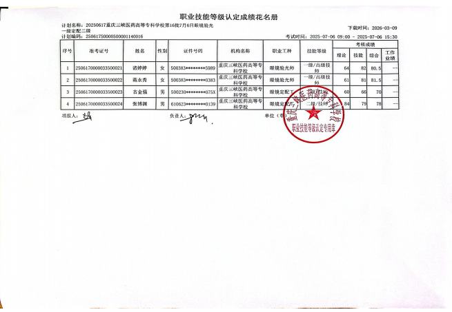 202500617重庆三峡医药高等专科学校2025年第16批7月6日眼镜验光一级定配二考试结束,现将考试成绩予以公示(详见附件)。