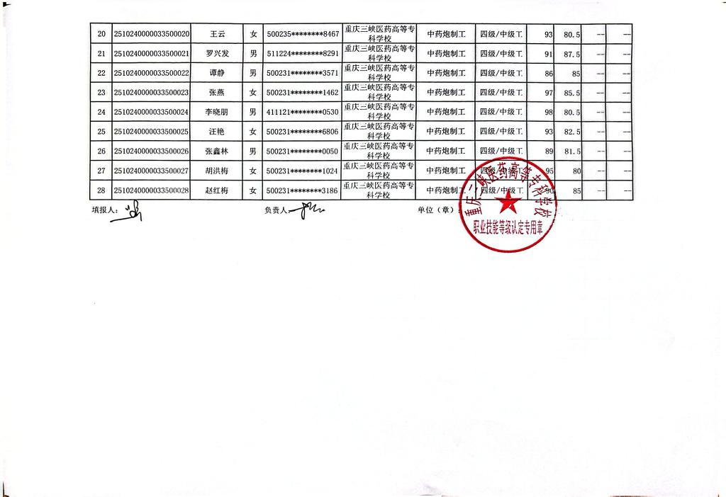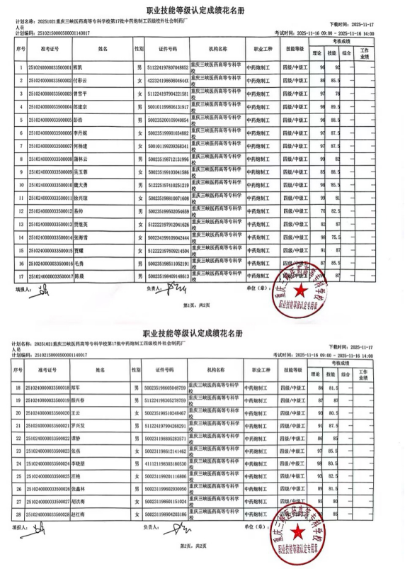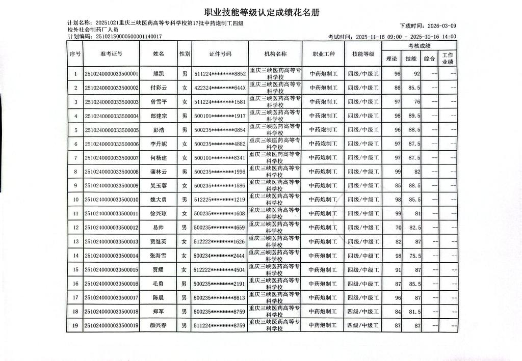 重庆三峡医药高等专科学校2025年第17批中药炮制工四级校外社会制药厂人员成绩公示