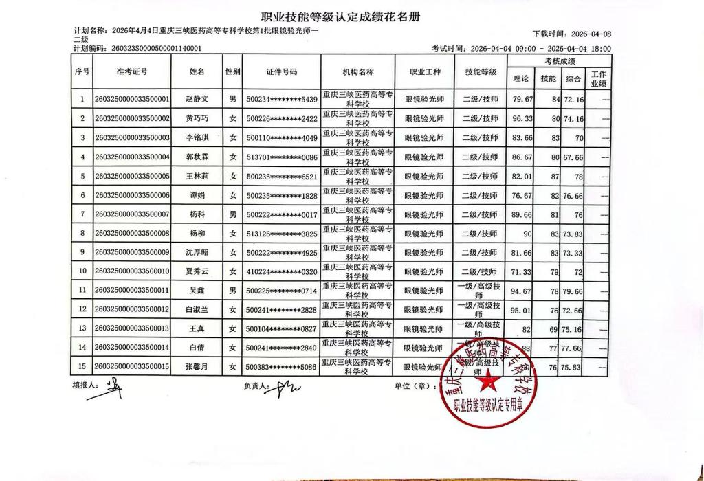 20260404重庆三峡医药高等专科学校第1批眼镜验光师一二级考试结束,现将考试成绩予以公示(详见附件)。