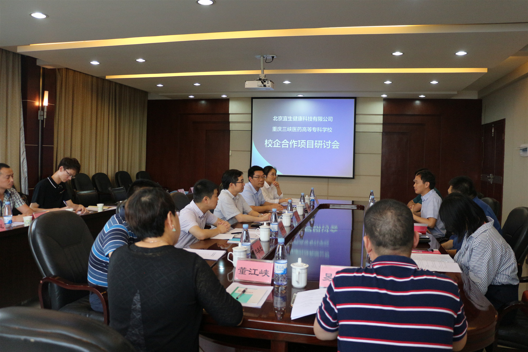 北京宜生健康科技有限公司总经理孙金政介绍了公司基本情况,及研发、培训、运营及互联网四大方面的综合实力,结合替代医学与中医外治技术的优势,指出了与学校合作发展的广阔前景。中医学院党总支书记董江峡与校企院合作部处长李魁华就实习生住宿及安全问题与孙金政总经理等人进行深入交流。