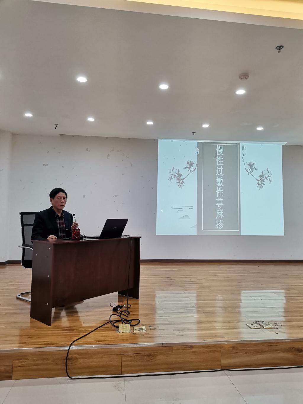 杨德全教授以皮肤病中医药治疗为题,讲述了中医药治疗常见皮肤病的优势与特色,详细介绍了湿疹、荨麻疹、粉刺等常见皮肤病的病因、病机和临床治疗经验,向同学们分享了自创的三白益母汤、乌蒺止痒汤等有效经验方。