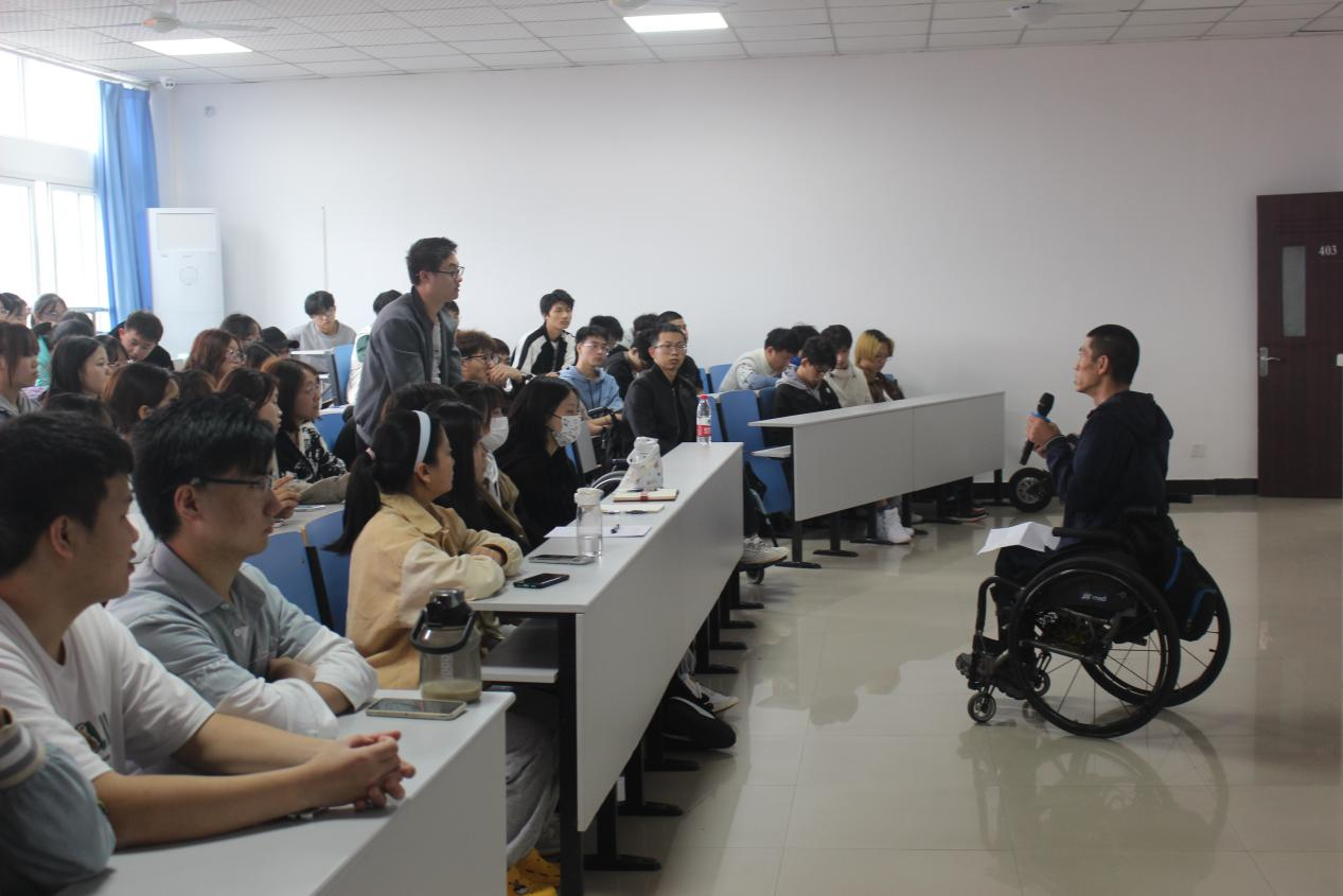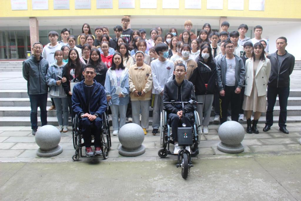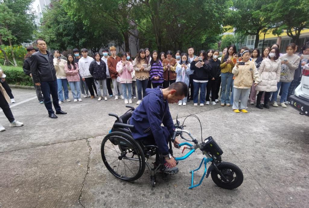 刘林介绍了自身因意外导致脊髓损伤、下肢瘫痪,但多年来坚持独立自强,并在康复辅具的帮助下完成了生活重建的经历。他的分享深深地激励了在场的同学。他从使用者的角度出发,介绍了轮椅的相关知识,并现场演示了如何使用辅助器具、独立上下及驾驶改造后的汽车,给同学们带来了一堂别开生面的实践教育课。刘林激励同学们要将“世上无难事,只畏有心人。有心之人,即立志之坚午也,志坚则不畏事之不成。”铭记于心,希望能与同学们一起不断学习,共同进步。