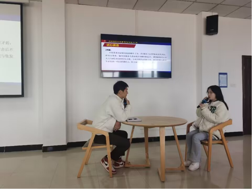 比赛包括案例研讨和谈心谈话两个阶段。第一阶段,参赛选手抽签组队形成AB角,通过“我提问,你回答”的方式考察辅导员对学生问题的抓取能力、研判能力和解决能力。第二阶段,以情景再现的方式与学生开展谈心谈话,考察辅导员教育引导、临场应变、解决实际问题和总结规律等方面的能力。